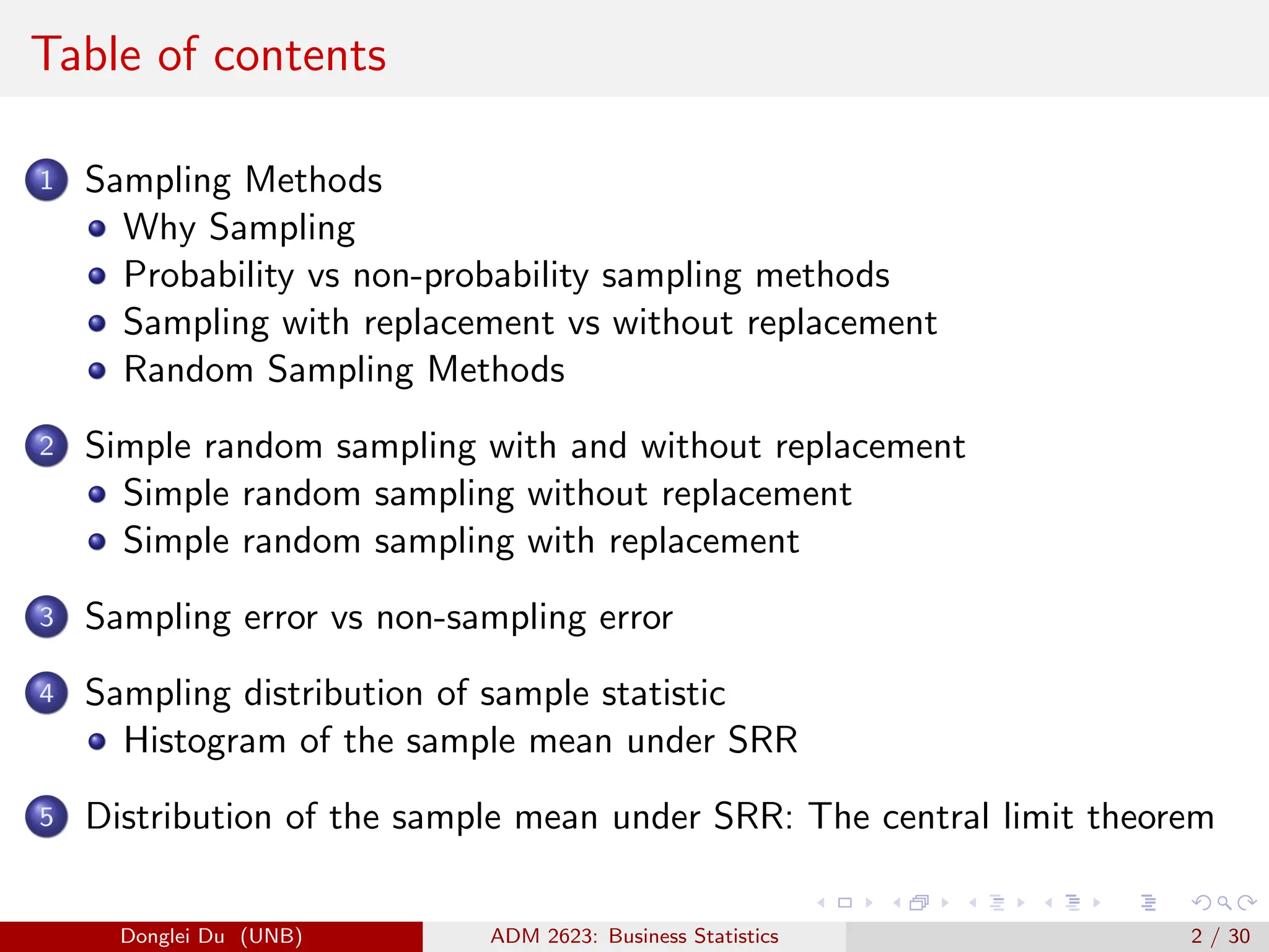 The document discusses various sampling methods used in statistics including probability and non-probability sampling, sampling with and without replacement, simple random sampling, stratified random sampling, and cluster random sampling. It provides examples of how to implement simple random sampling with and without replacement in R code. Key concepts covered include sampling error versus non-sampling error and the sampling distribution and central limit theorem as they apply to the sample mean under simple random sampling with replacement.