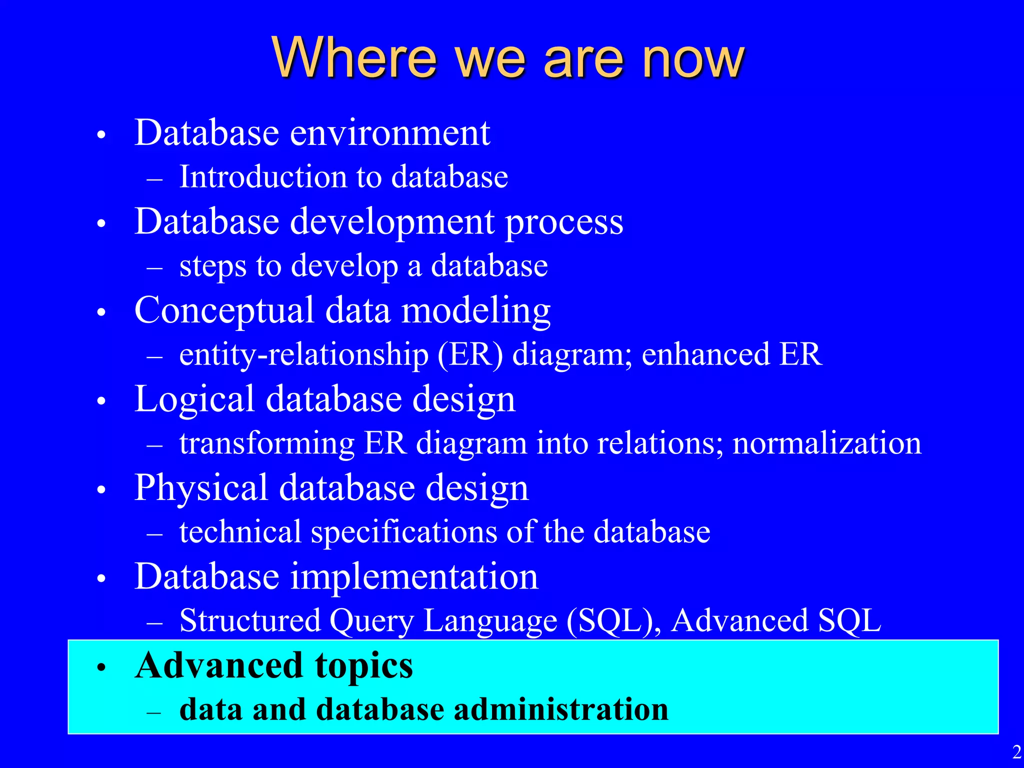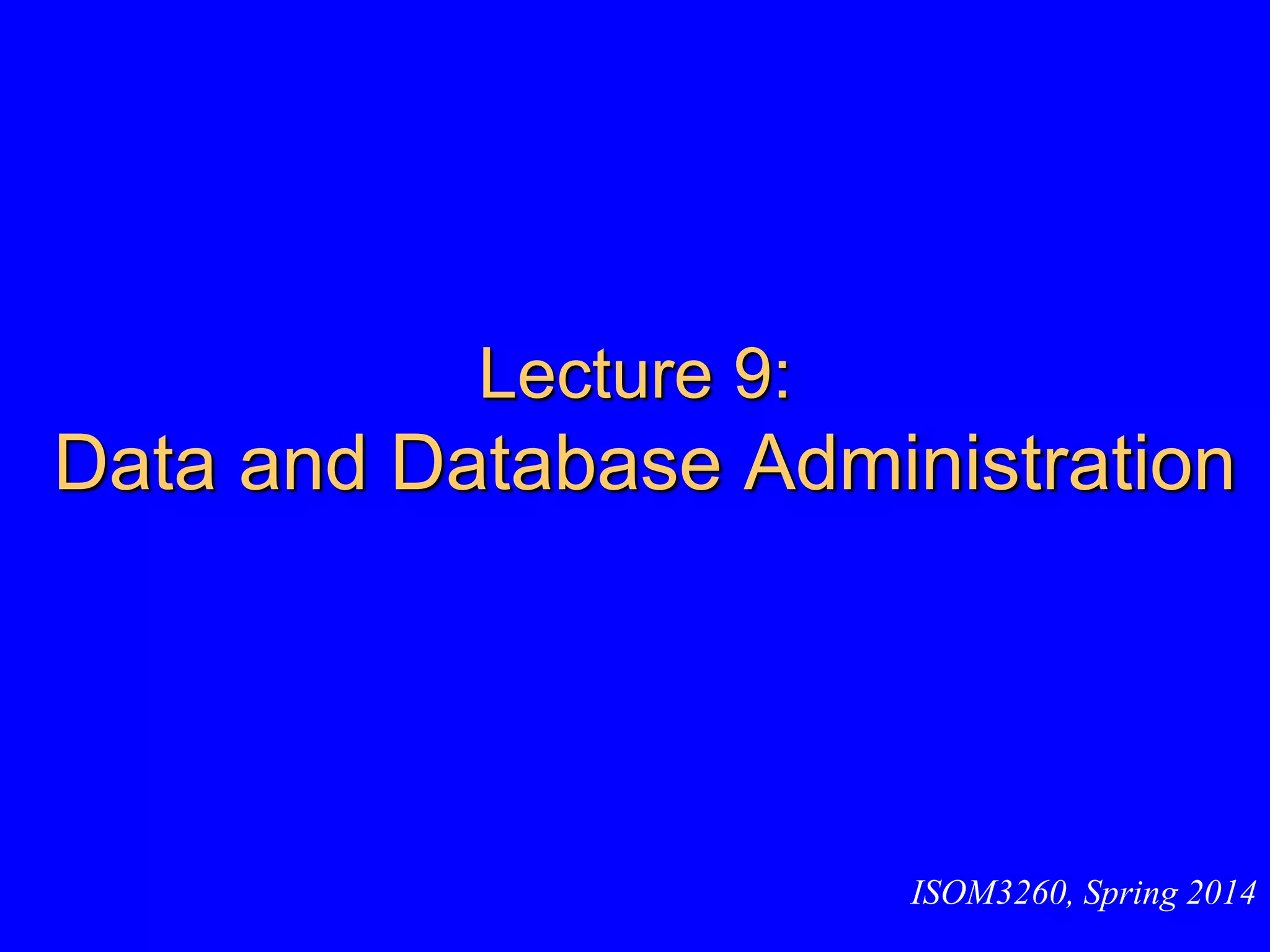 The document discusses data and database administration. It covers: