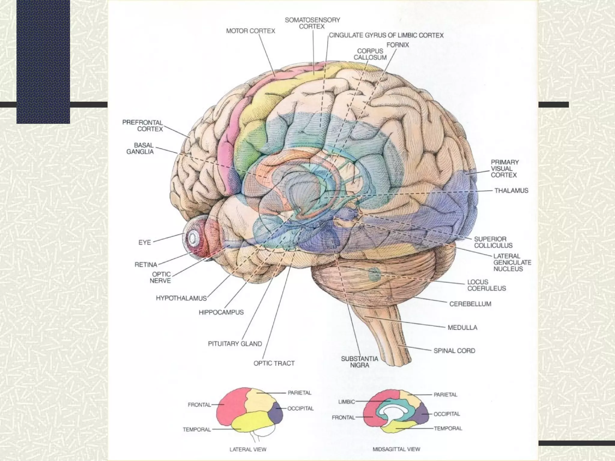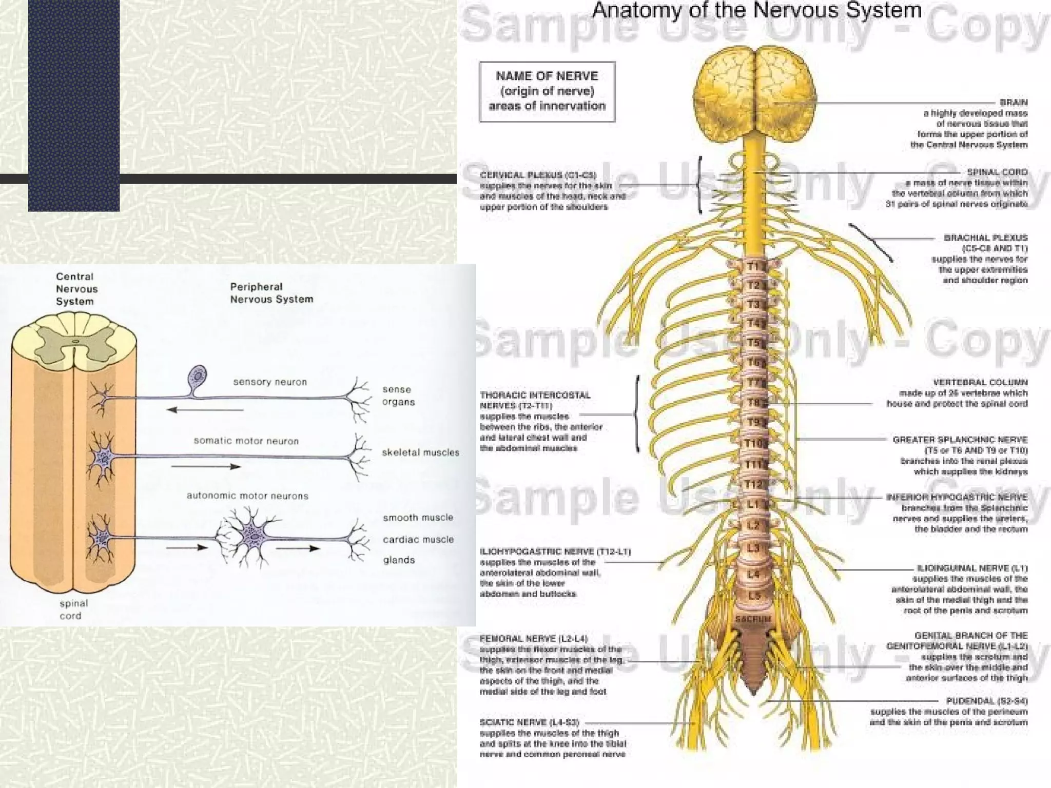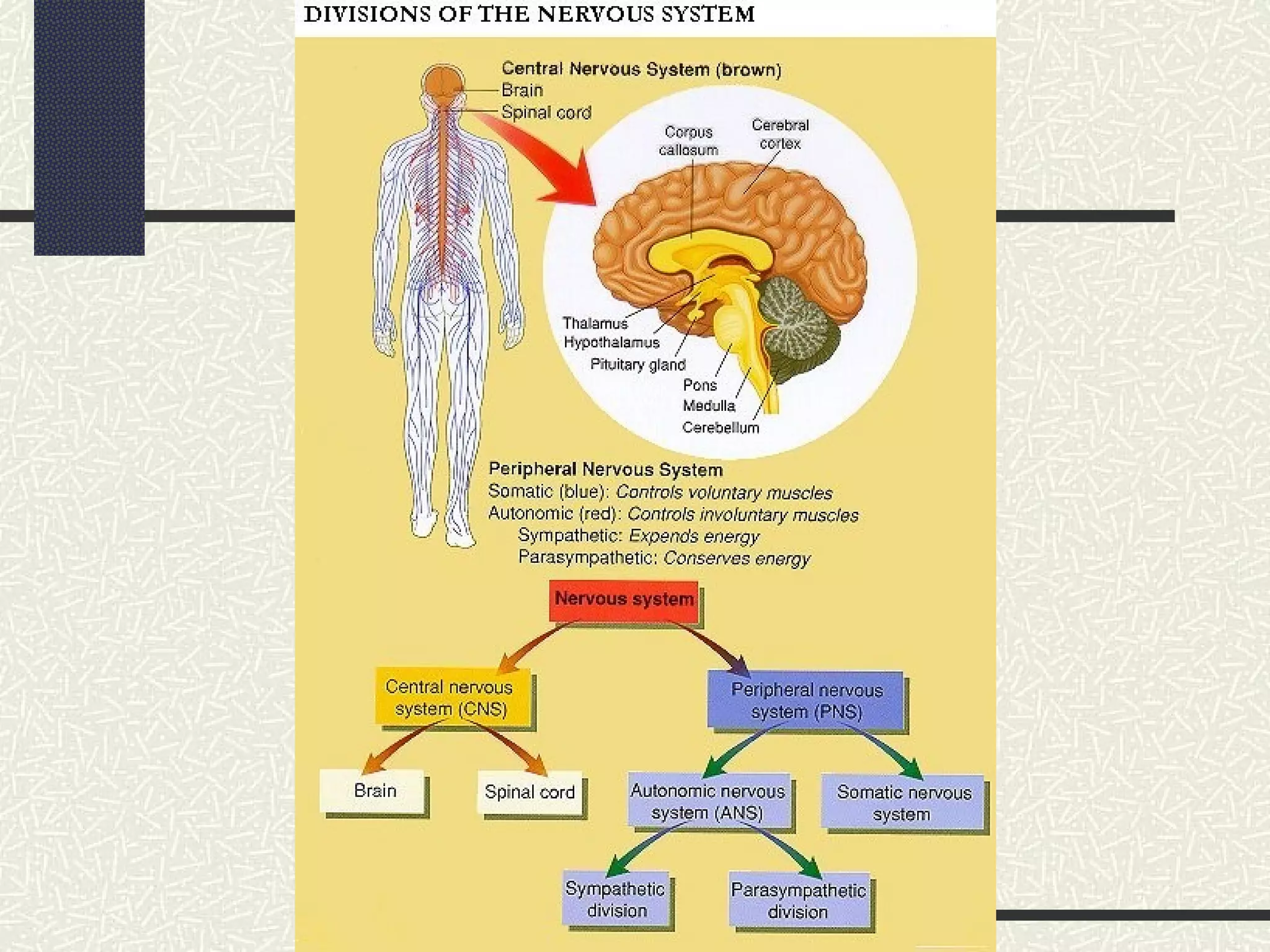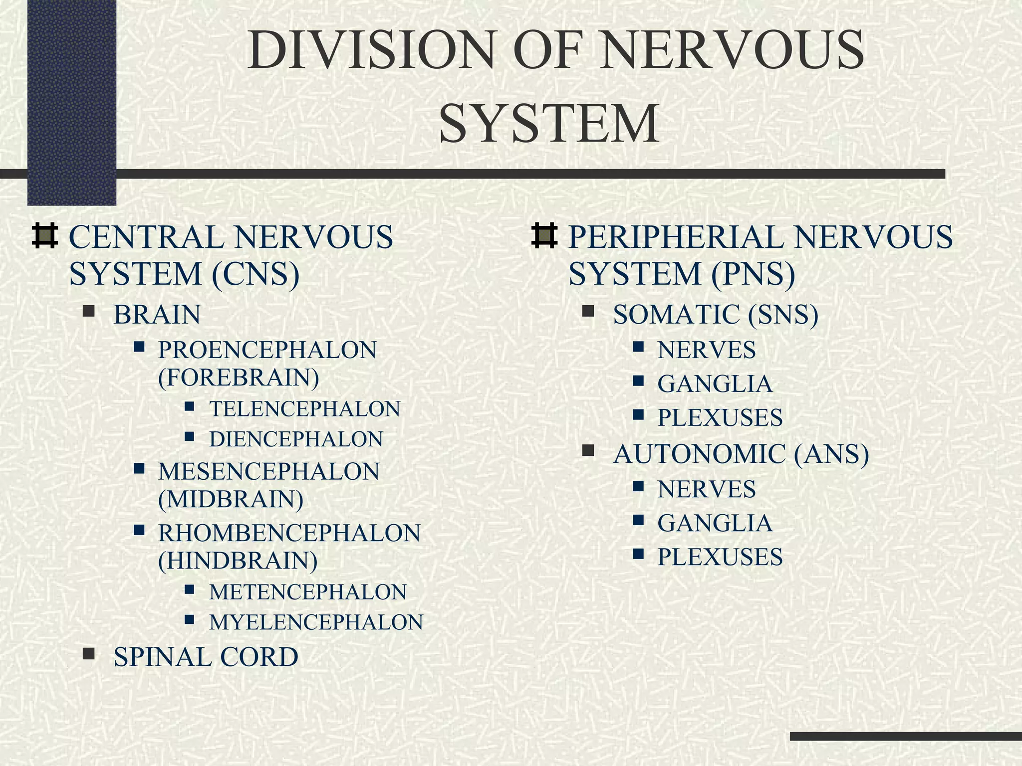 The central nervous system consists of the brain and spinal cord. The brain is divided into the telencephalon, diencephalon, mesencephalon, and rhombencephalon. The central nervous system develops from the neural plate and neural tube during embryogenesis. It contains gray matter, made up of neuron cell bodies, and white matter composed primarily of myelinated axons. The peripheral nervous system connects the central nervous system to the rest of the body.