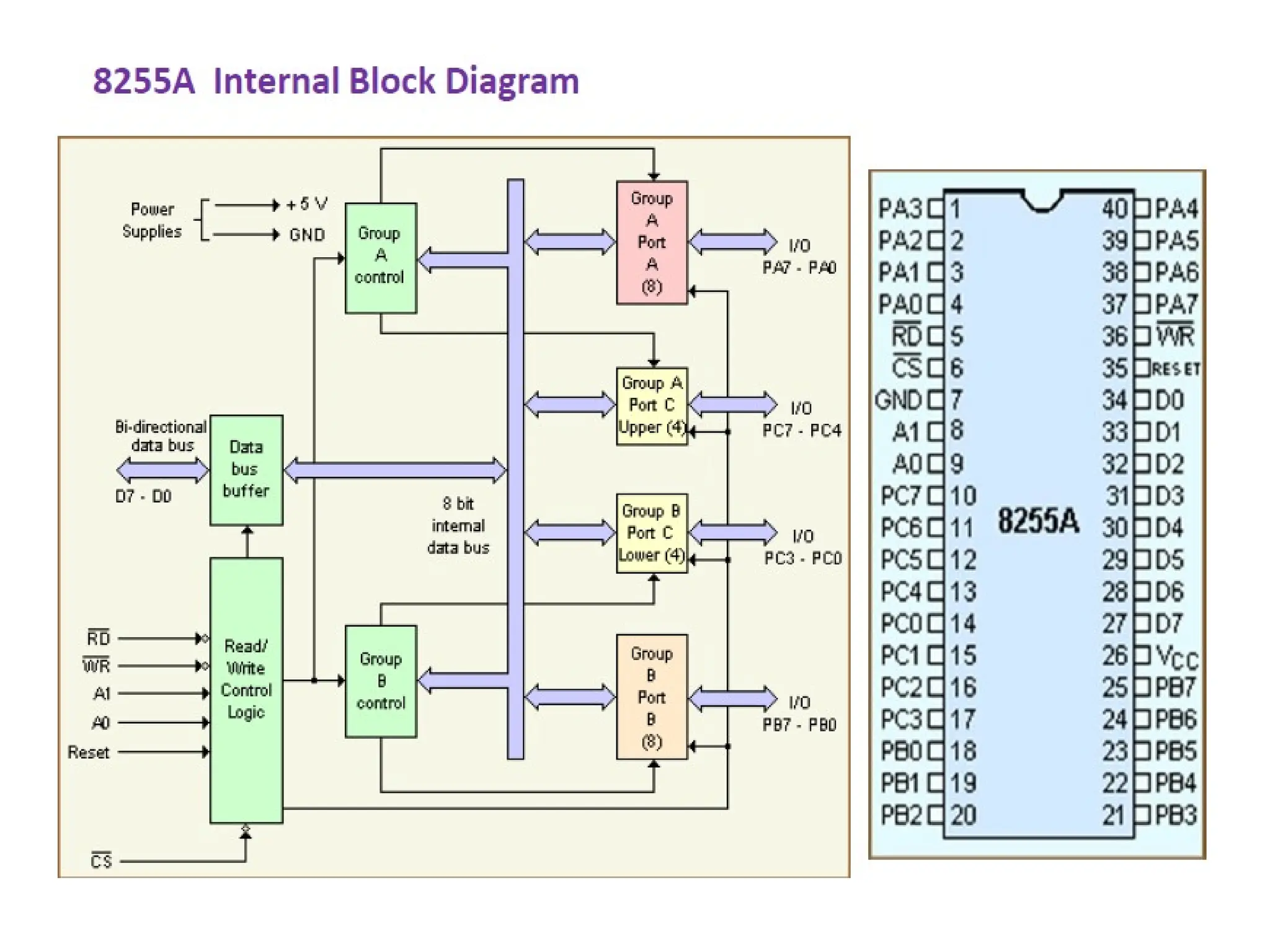 Port A and upper 4 bits of Port C are controlled by Group A control. Port B and lower