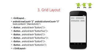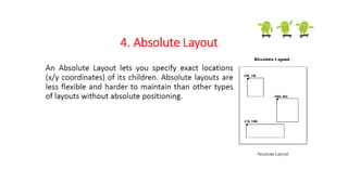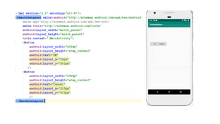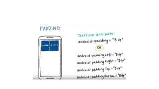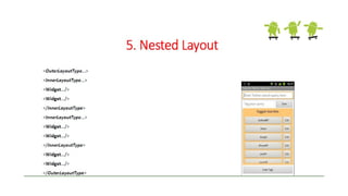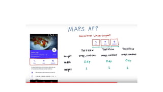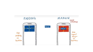 The document covers mobile design principles focusing on Android development, including designing for various screen sizes and densities, utilizing layout properties like match_parent and wrap_content, and understanding different view types such as TextView, EditText, and ImageView. It also introduces key concepts like adaptive UI, material design, XML for layout definitions, and event listeners for UI interactions. Practical examples and code snippets illustrate the usage of various layouts and widgets in Android development.