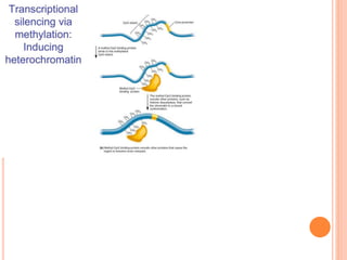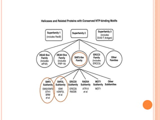 1. Chromatin remodeling complexes use ATP hydrolysis to modify nucleosome structure and expose DNA for gene expression. The main classes are ATP-independent complexes and ATP-dependent complexes like ISWI and SWI/SNF.