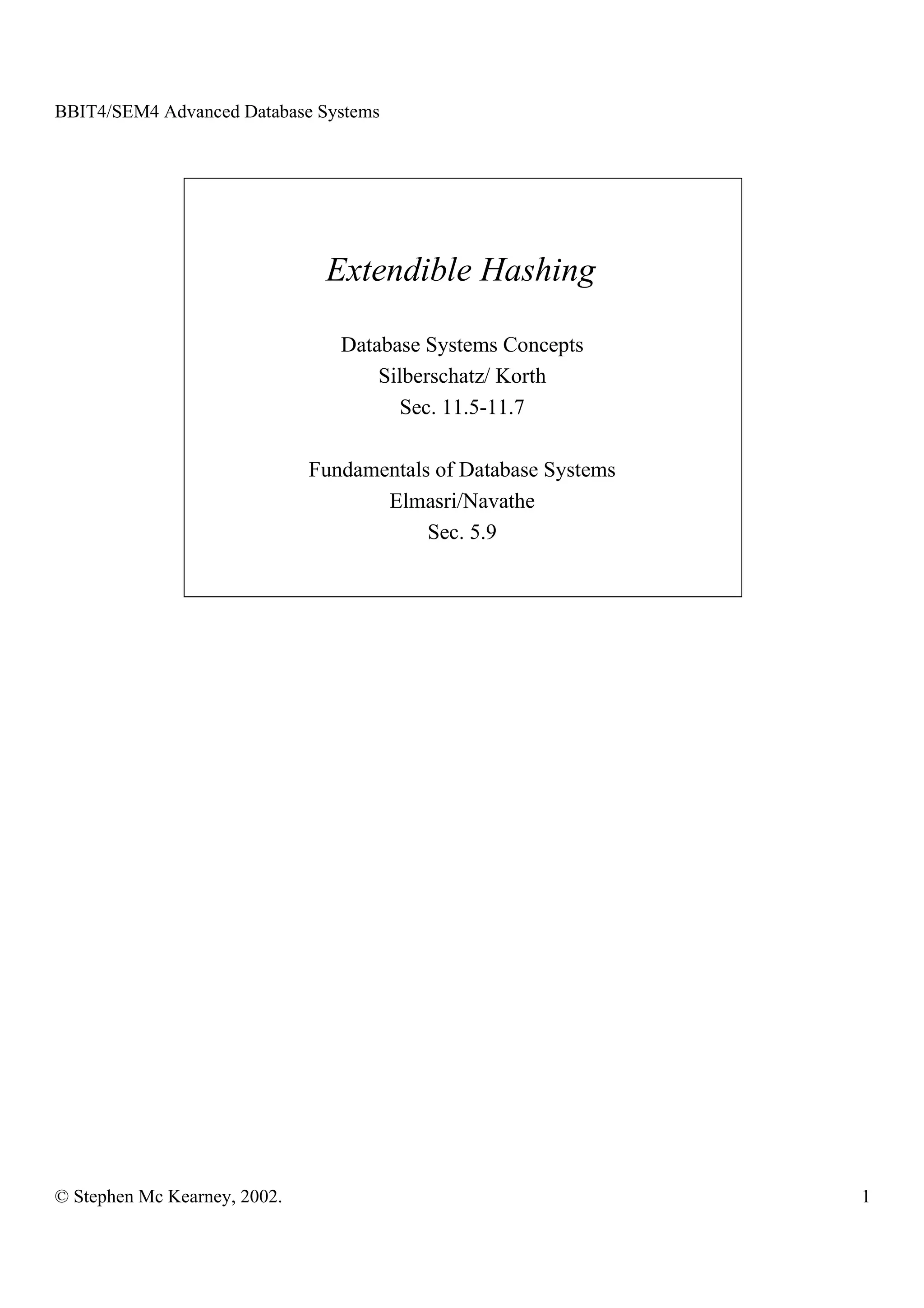 This document discusses extendible hashing and static hashing. Static hashing uses a single hash function to map records to fixed storage locations, which can cause collisions when the number of records exceeds locations. Extendible hashing solves this by allowing the number of locations to increase by splitting buckets as needed. It uses a binary hash function and binary addressing to map records across a hierarchical structure of buckets that can expand efficiently.