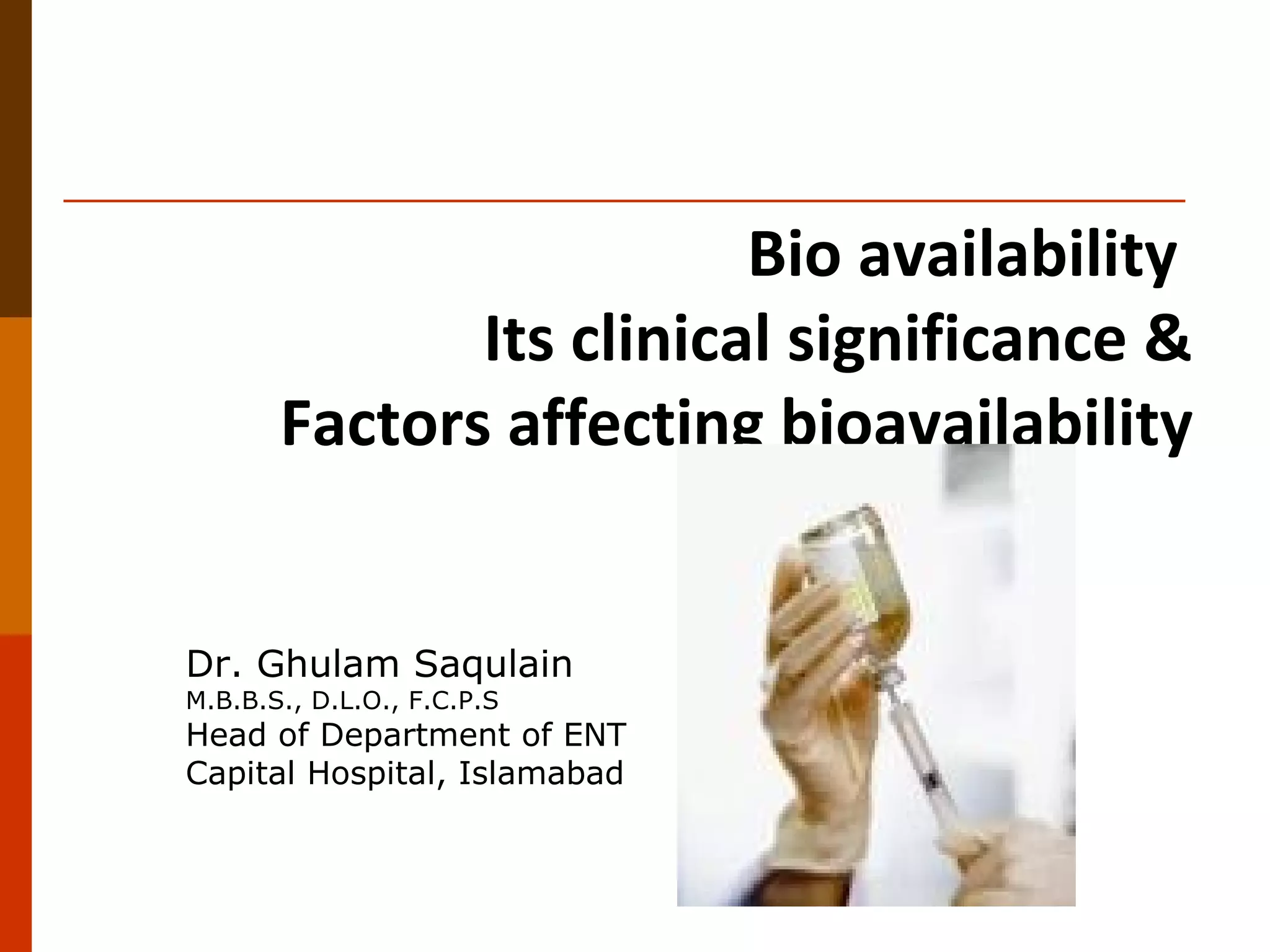 Bioavailability refers to the amount of drug that enters systemic circulation and is available at the site of action. It depends on the rate and extent of drug absorption from its dosage form. Many physiological and drug-specific factors can affect bioavailability such as pH, enzymes, blood flow, and food interactions. Careful evaluation and standardization of bioavailability is important for drug development and quality control to ensure accurate and safe dosing.