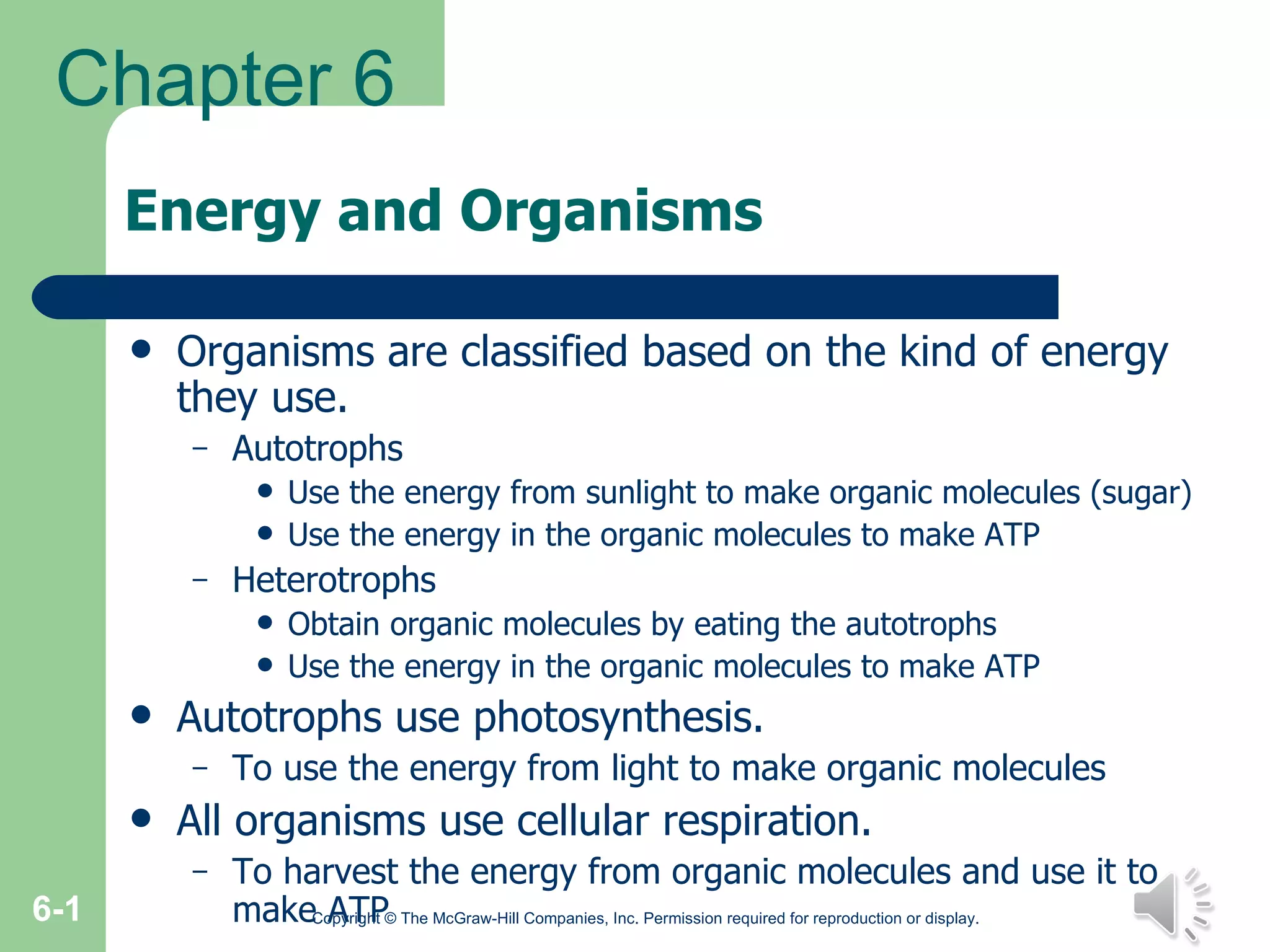 The document discusses cellular respiration and energy production in organisms. It explains that autotrophs use photosynthesis to convert sunlight into organic molecules like sugar to produce ATP through cellular respiration. Heterotrophs obtain organic molecules by consuming autotrophs and also use cellular respiration to produce ATP. The process of aerobic cellular respiration uses oxygen and involves glycolysis, the Krebs cycle, and the electron transport chain to fully oxidize glucose and produce large amounts of ATP. Anaerobic cellular respiration occurs without oxygen through fermentation pathways like lactic acid or alcoholic fermentation.