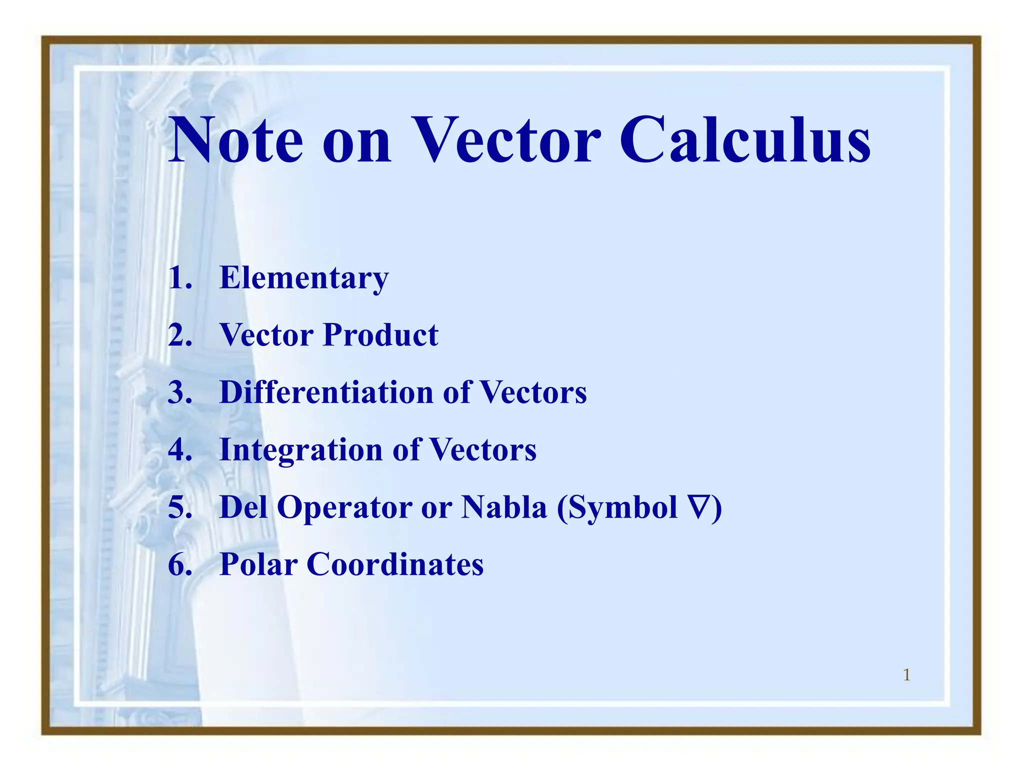 The document covers fundamental concepts in vector calculus, including definitions of vectors and scalars, operations like addition, subtraction, and products (dot and cross), and applications such as integration and differentiation of vectors. Key topics include the del operator, line and surface integrals, and theorems like Green's and Stokes' theorem. Numerous examples and exercises are provided to illustrate the principles and calculations involved in vector analysis.