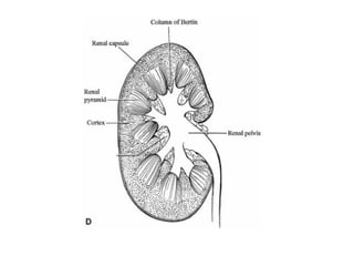 The document describes various ultrasound images of the kidneys, ureters, bladder, and surrounding structures. It shows normal anatomy as well as various pathological conditions including cysts, tumors, infections, kidney stones, and other abnormalities. Multiple images are presented and described to demonstrate different diseases and conditions that can be identified on ultrasound.