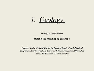 1. Geology is the study of the Earth, including its chemical and physical properties, formation processes, and changes from creation to present day.