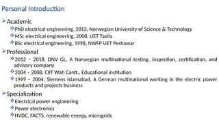 The document introduces power electronics, detailing the author's educational background, professional experience, and course structure. It covers key concepts like power conversion, types of converters, and the functionality of electronic switches such as diodes and transistors. Applications and future trends in power electronics are also discussed, emphasizing the importance of efficient power management systems.