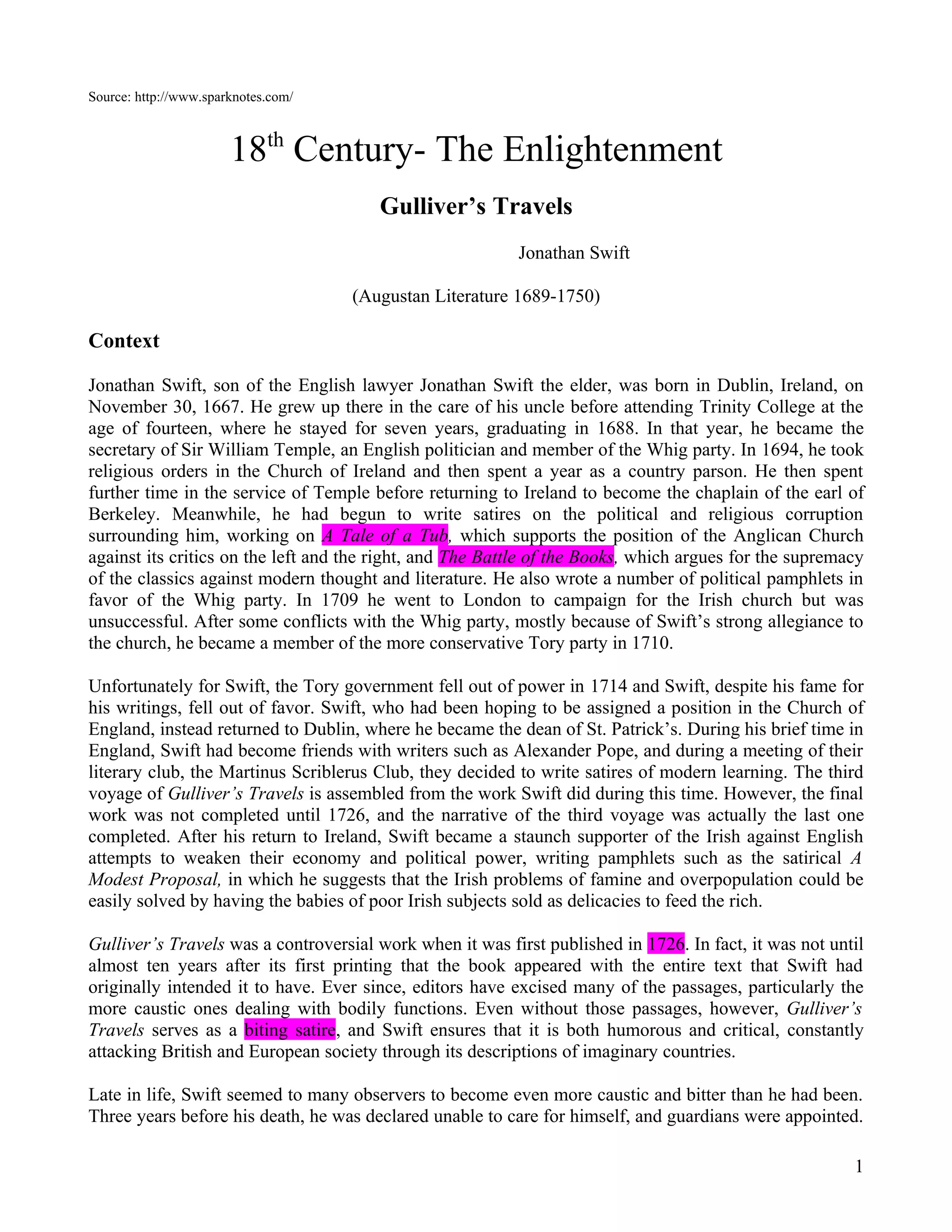 1) Jonathan Swift wrote Gulliver's Travels in 1726 as a satire of human society and nature. The story follows Lemuel Gulliver on four voyages to fantastical lands where he encounters societies that satirize aspects of 18th century Europe.