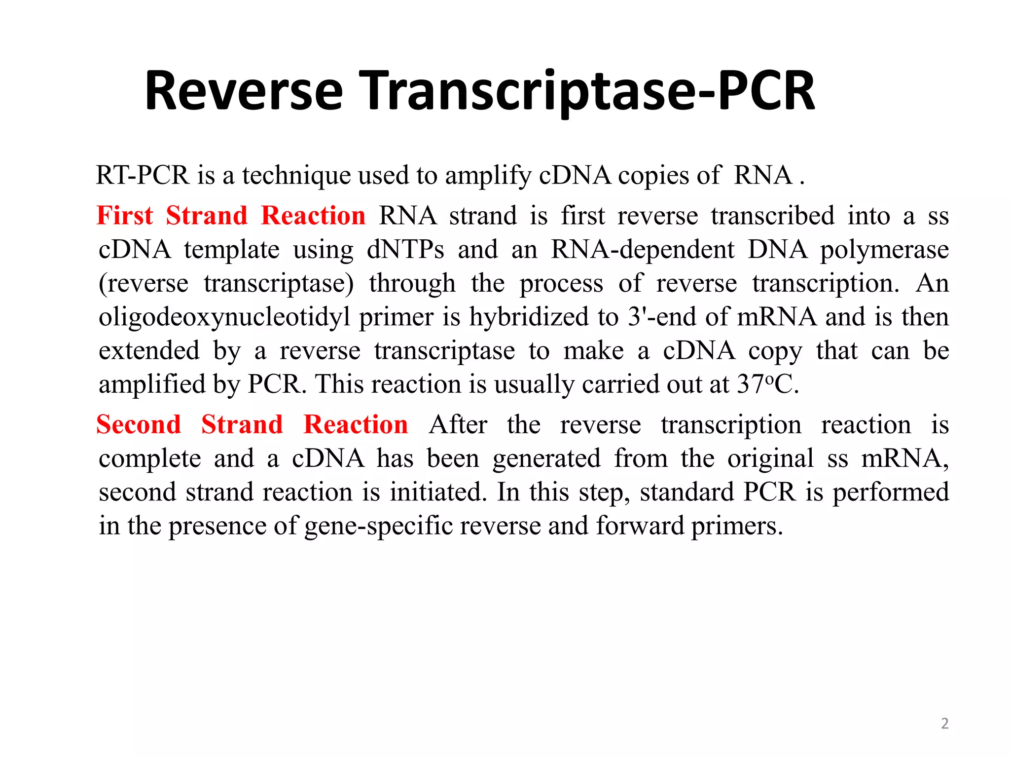 Reverse transcriptase PCR (RT-PCR) is used to amplify cDNA copies of RNA. It involves reverse transcribing RNA to cDNA then amplifying the cDNA with PCR. RT-PCR can be used to study gene expression and diagnose genetic diseases. Variations include band-stab PCR which reamplifies low yield fragments, degenerate PCR which uses mixed primers for related gene families, and anchored PCR which attaches a known sequence to amplify unknown 5' sequences. Real-time PCR monitors fluorescence during amplification to quantify templates in each cycle, allowing visualization of reactions in real-time. It is commonly used to measure changes in gene expression.