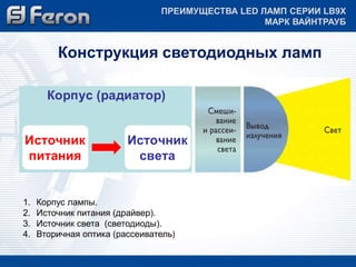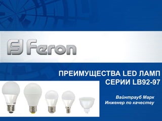 Документ обсуждает преимущества светодиодных ламп серии LB9х, разработанных Марком Вайнтраубом, включая использование новых материалов и более мощных светодиодов для повышения светового потока и снижения себестоимости. Также рассмотрены технические характеристики различных моделей ламп, их компоненты, а также вопросы, связанные с цветовой температурой и пульсациями освещенности. В заключение представлены контакты для дальнейших вопросов и обратной связи.
