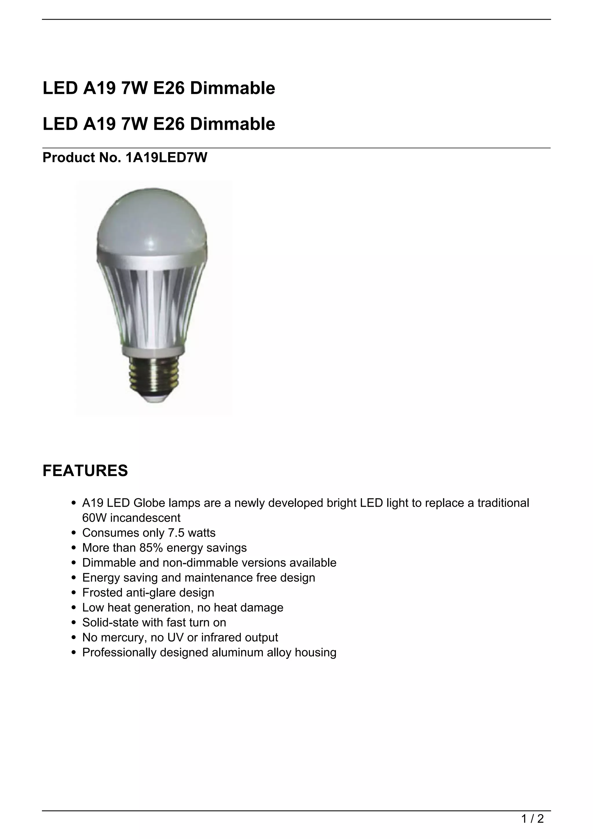 This document provides product details for an LED A19 7W E26 Dimmable light bulb that consumes only 7.5 watts but provides the brightness of a 60W incandescent bulb, saving over 85% in energy. It is available in dimmable and non-dimmable versions with a frosted anti-glare design and generates low heat. The bulb has a rated lifespan of 50,000 hours and is suitable for use in homes, offices, retail stores and more.