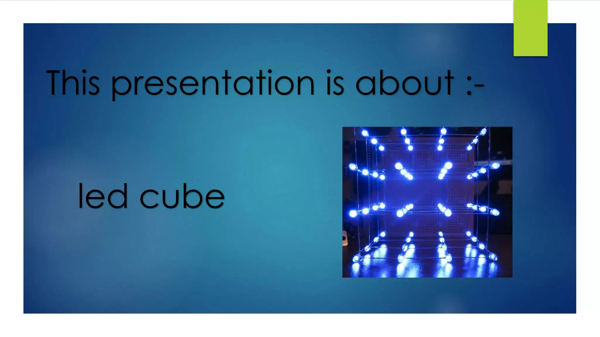This presentation is about an LED cube. It describes the cube as having multiple LED layers that can be controlled individually by connecting each layer to ground while pulsing data to drive the LEDs. Instructions are provided on how to construct an LED cube in 4 steps, and it is recommended to watch a video for guidance on the construction process. Links are included to example LED cube videos for inspiration.