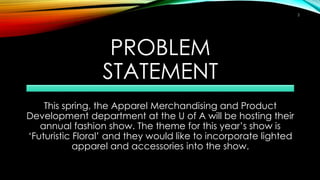 The document discusses plans for incorporating lighted apparel and accessories into the University of Arkansas Apparel Merchandising and Product Development department's annual fashion show, which has a theme of "Futuristic Floral". The lighted items will use LEDs and controllers to adjust color and intensity, and the controllers will allow colors to blend when garments are near each other. The scope of the project involves LED lighting for 13-15 garments and enhancements to the show and runway lighting.