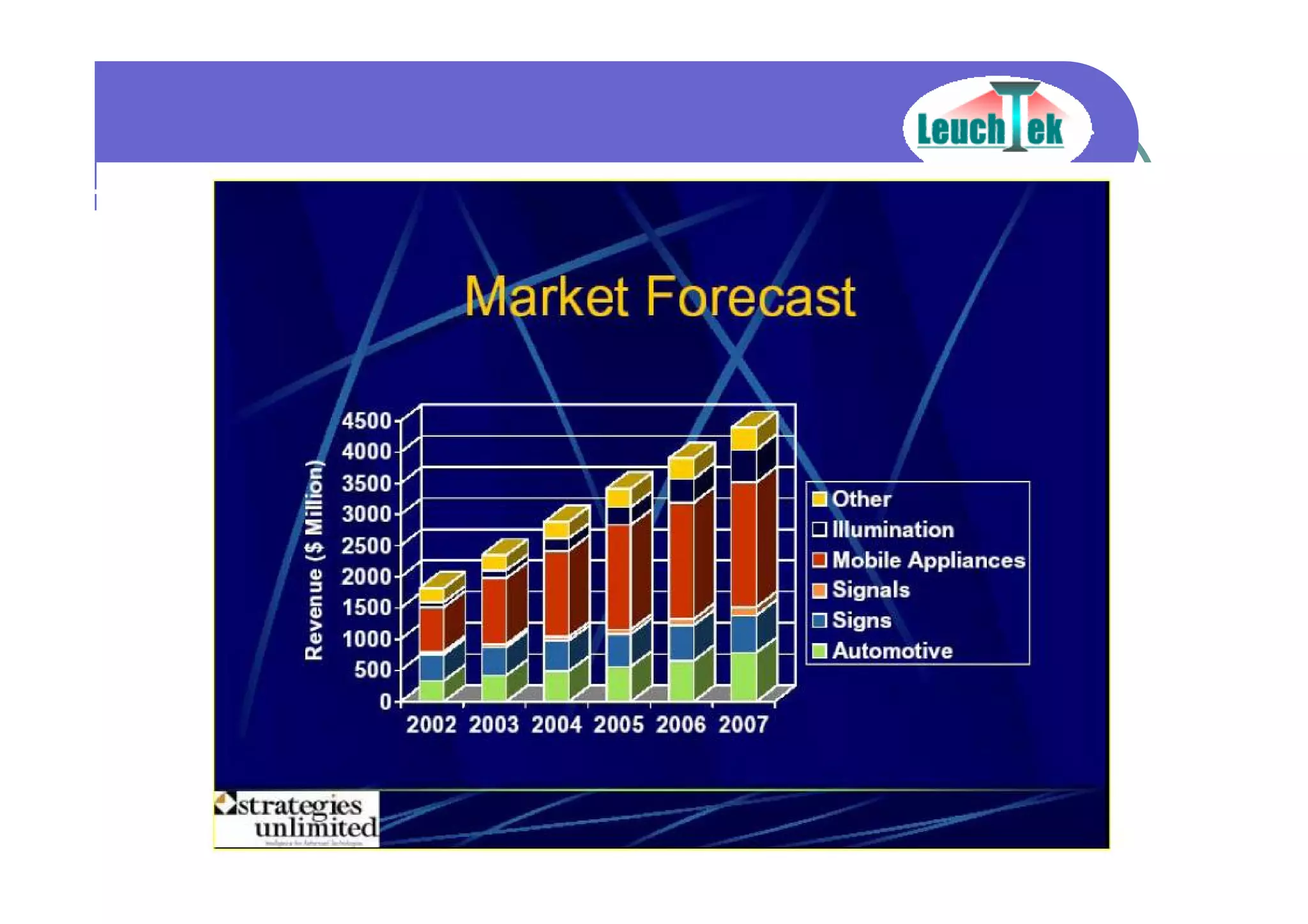 LeuchTek is a lighting company that produces and markets LED lighting products. The document provides background on LED lighting technology, highlighting its advantages over traditional lighting like long life, high efficiency, small size, and short reaction time. It then gives an overview of LeuchTek's product portfolio, which includes 3W to 200W spot lights, day lighting bulbs, and discrete LED chips. The document also lists the company's strengths in offering high-power LED products at competitive prices and with patented designs.
