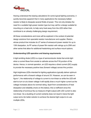 Efficient LED lighting requires choosing the correct current-limiting resistor. LEDs require a direct current to provide a forward voltage and operate most efficiently around 3V, but drawing too much current reduces lifespan. Using multiple LEDs in series requires less power from the resistor than overdriving single LEDs. Resistor selection depends on factors like supply voltage, LED voltage, desired current, and tolerances. Higher power LEDs may require resistors rated for over 10W, and wirewound or film resistors can meet these needs. Understanding LED operation helps specify the right resistor type.