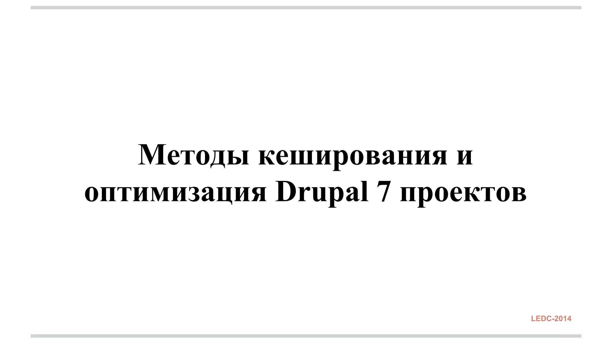 Документ обсуждает методы кэширования и оптимизации проектов на Drupal 7, включая функции из коробки и дополнительные модули, такие как 'views', 'entity cache' и 'boost'. Упоминаются также сторонние решения, такие как 'memcached' и 'apc', для повышения производительности. В заключении содержатся выводы и рекомендации для пользователей, которые хотят улучшить эффективность своих проектов.