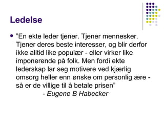 Ledelse ” Enekte leder tjener. Tjener mennesker. Tjener deres beste interesser, og blir derfor ikke alltid like populær - eller virker like imponerende på folk. Men fordi ekte lederskap lar seg motivere ved kjærlig omsorg heller enn ønske om personlig ære - så er de villige til å betale prisen” - Eugene B Habecker