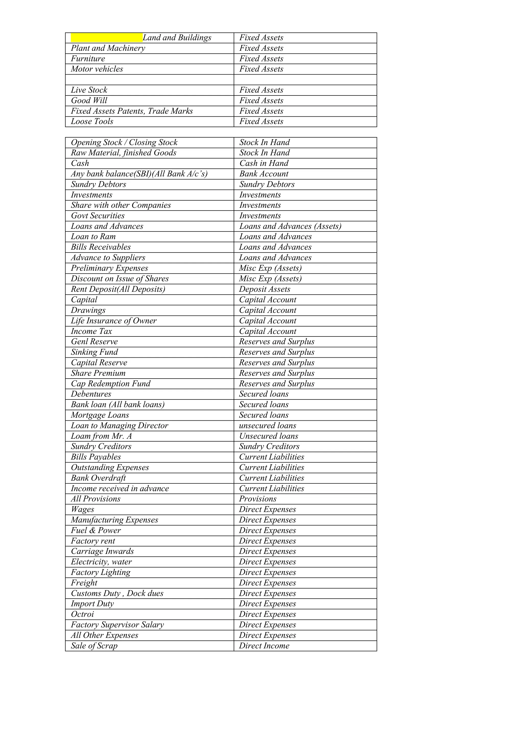 This document contains a list of accounting terms categorized into different types of accounts including fixed assets, current assets, capital account, reserves and surplus, secured and unsecured loans, current liabilities, direct and indirect expenses and incomes, taxes, purchase and sales accounts. It provides definitions and classifications for items like land, plant, machinery, furniture, vehicles, stock, raw materials, cash, debtors, investments, loans, preliminary expenses, capital, reserves, debentures, bank loans, creditors, wages, rent, interest, depreciation, purchases and sales.