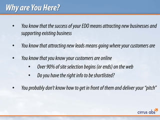 This document provides an overview of effective online marketing strategies for local economic development organizations. It discusses determining marketing goals and target audiences, developing an online presence through a professional website with relevant content and tools, and optimizing search engine visibility through techniques like SEO, social media engagement, and frequent updates of fresh content. The presentation emphasizes having a clear plan and measuring results to focus efforts on most effective tactics.