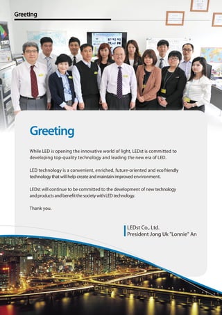 LEDst is a company committed to developing high-quality LED technology and products. They have developed two innovative white LED technologies called XENOLEDTM 400 and XENOLEDTM 450 that use near-violet or blue LED chips with RGBY phosphors to produce white light with spectra similar to sunlight and high color rendering indices over 90%, addressing needs for applications like lighting in art galleries and medical facilities. LEDst has a long history of research and development as well as international expansion and partnerships.