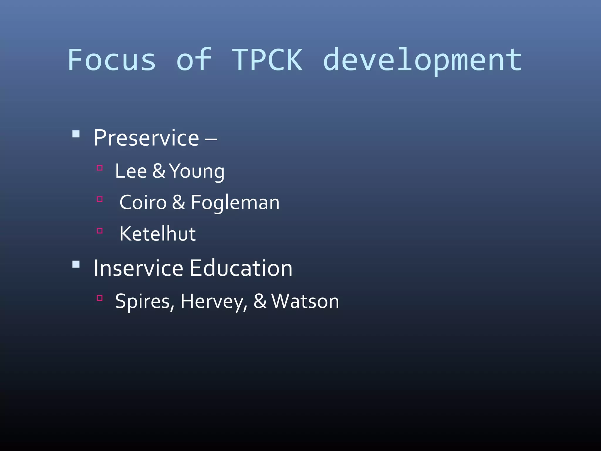 This document summarizes research on developing teachers' technological pedagogical content knowledge (TPCK). It discusses topics like how to best develop TPCK in preservice and inservice teachers, insights from teachers who have developed TPCK, challenges of applying theory to practice, and how to assess TPCK. The document also includes a framework that categorizes ways technology can impact instruction, student learning, and curriculum as replacement, amplification, or transformation.
