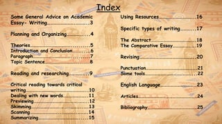 This document provides advice on various aspects of academic essay writing such as planning, organizing, developing a thesis, writing introductions and conclusions, structuring paragraphs, taking notes, reading critically, dealing with new vocabulary, and avoiding plagiarism. It discusses formatting different types of academic writing like abstracts, comparative essays, and annotated bibliographies. Tips are provided on revising, editing, punctuation, and proper use of the English language. Specific techniques are outlined for previewing, skimming, scanning and summarizing texts.
