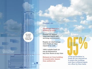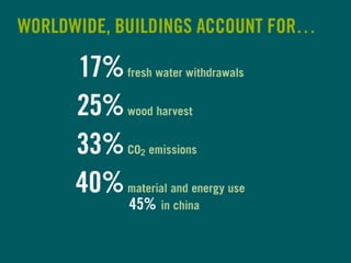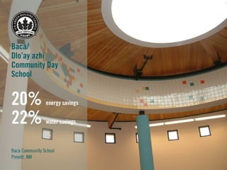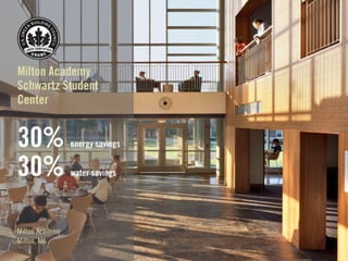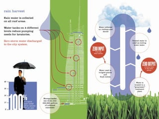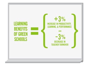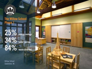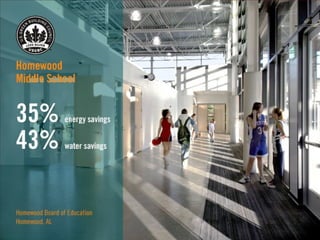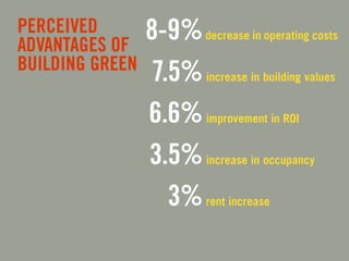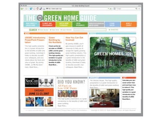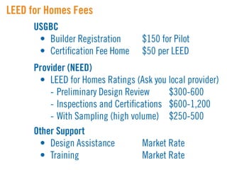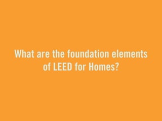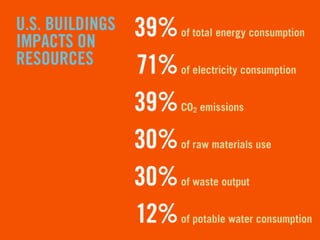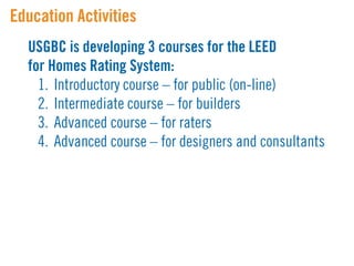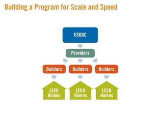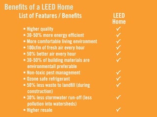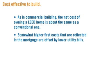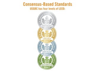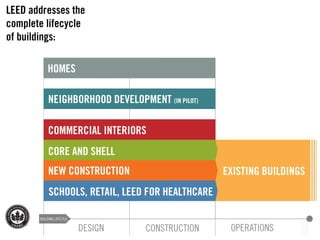 LEED (Leadership in Energy and Environmental Design) is a benchmark for the design, construction, and operation of green buildings. It provides building owners tools to improve building performance in areas like energy savings, carbon savings, water use reduction, and cost savings. LEED aims to promote sustainability through establishing standards, recognizing environmental leadership, and stimulating green competition to raise awareness of green building benefits and transform the building market.