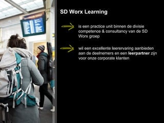 SD Worx Learningis een practice unit binnen de divisie competence & consultancy van de SD Worx groep wil een excellente leerervaring aanbieden aan de deelnemers en een leerpartner zijn voor onze corporate klanten