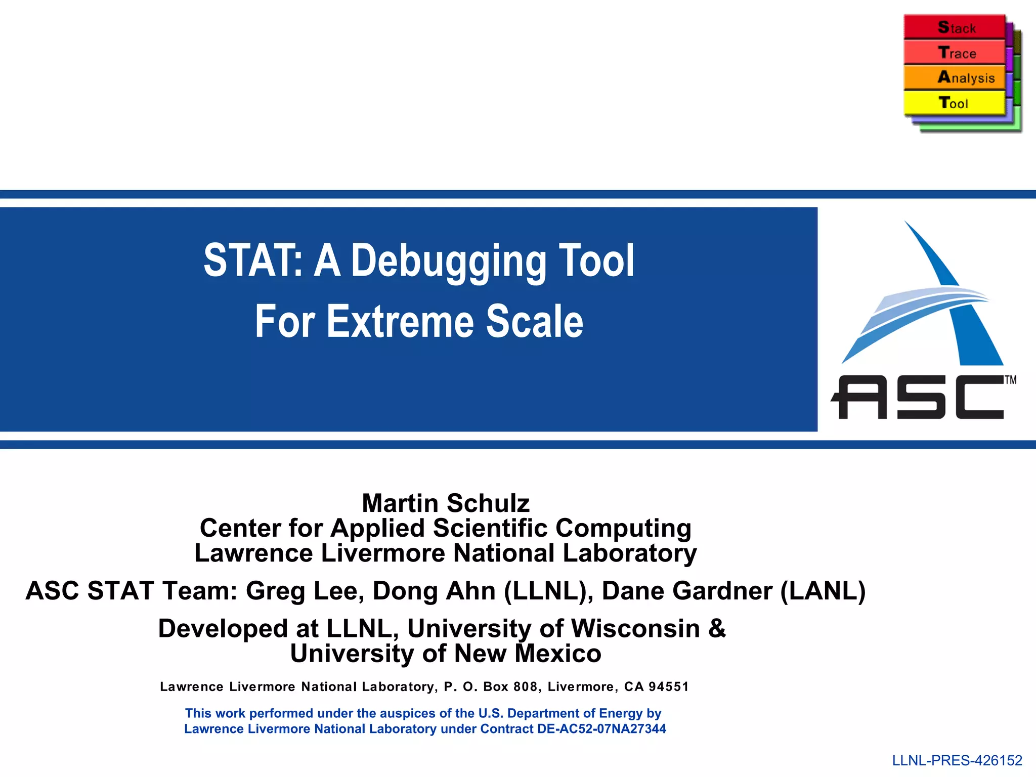 STAT is a debugging tool for extreme scale applications that can gather stack traces from multiple processes and samples to help identify issues. It uses tree-based data structures to efficiently aggregate and analyze stack trace data from over 10,000 tasks. STAT provides both a graphical user interface and command line interface, and can help debug issues like hangs or deadlocks by showing what processes are doing.