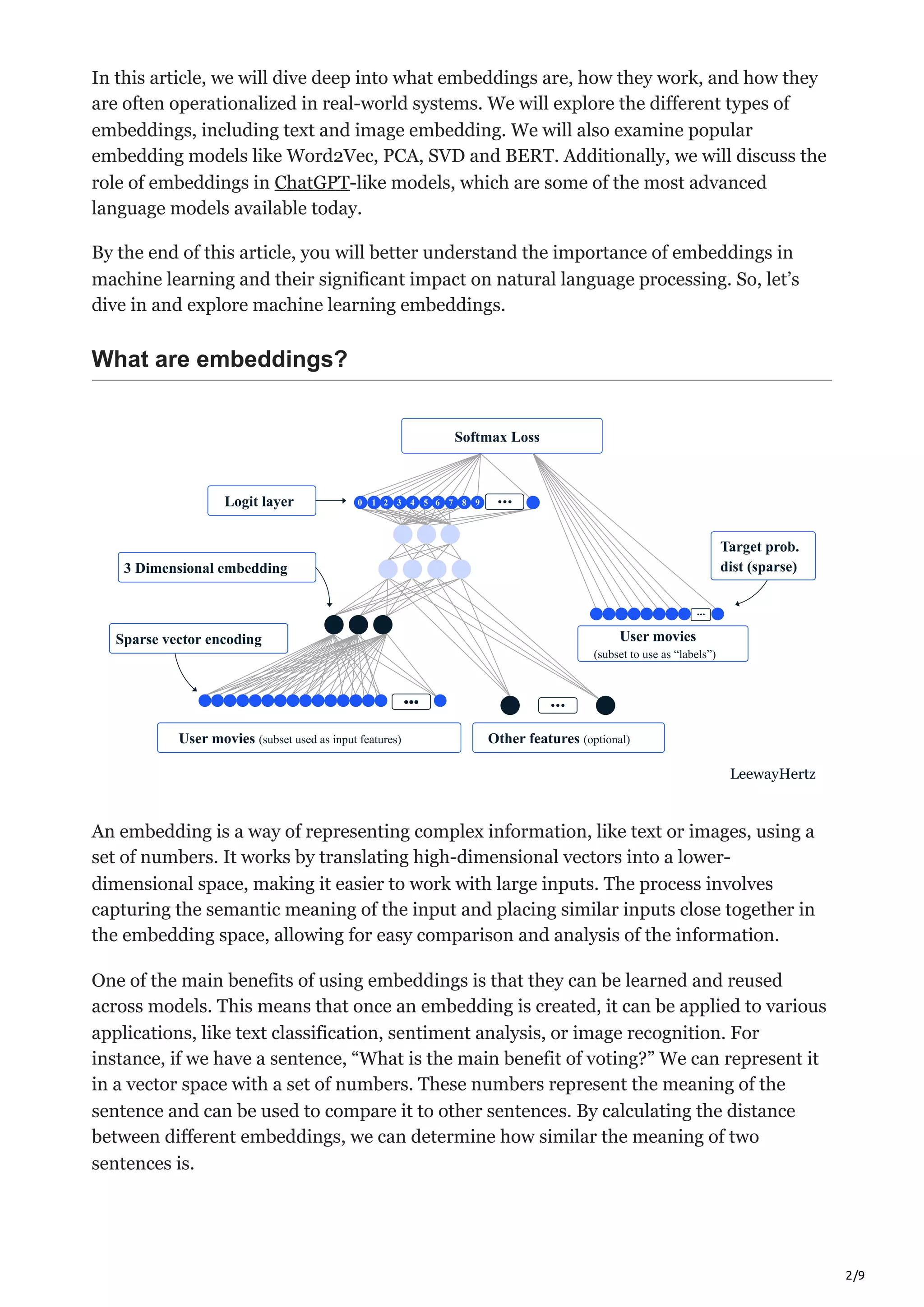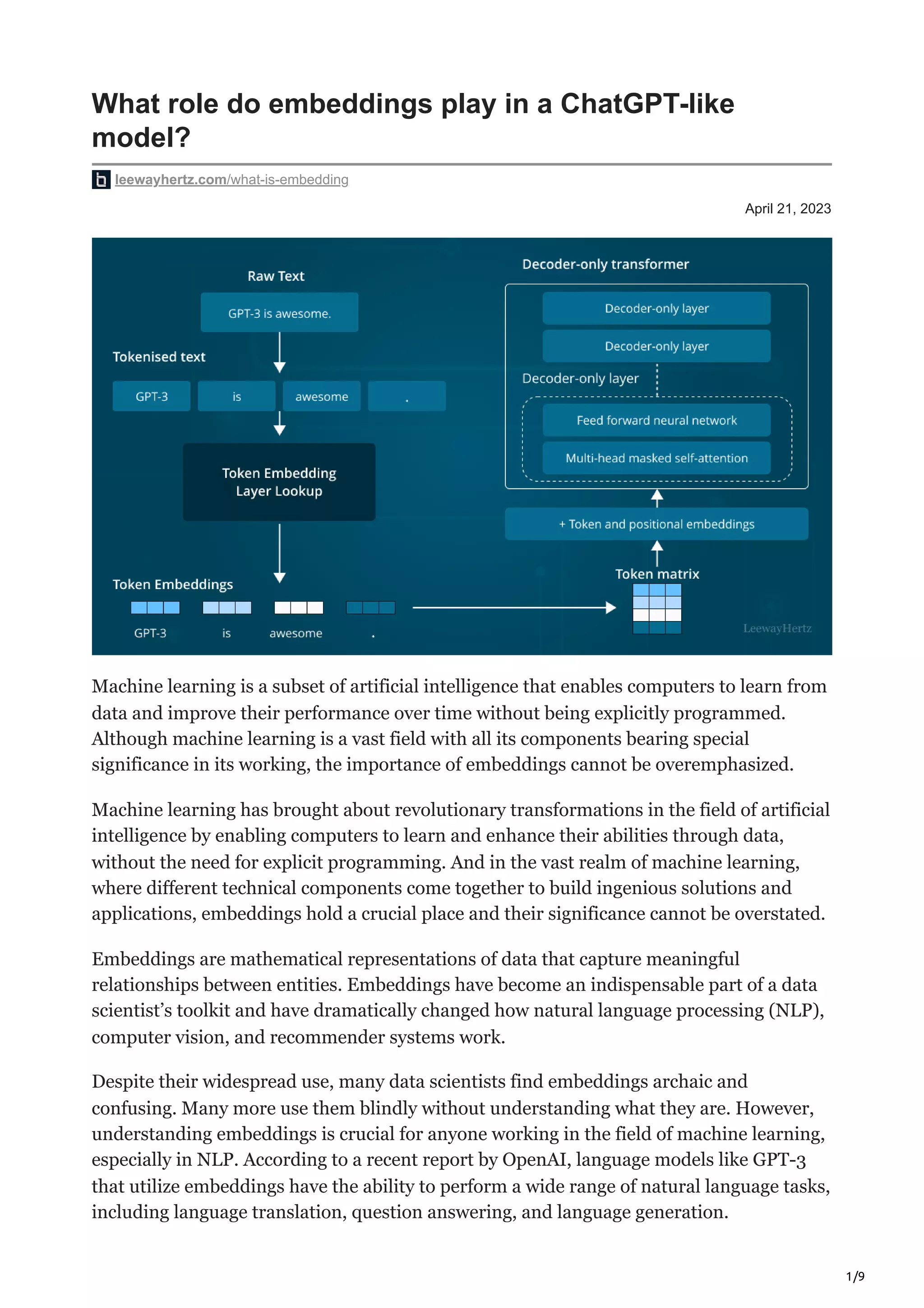 Embeddings play a crucial role in language models like ChatGPT by creating a lower-dimensional representation of data to improve analysis of complex inputs like text. Embeddings capture relationships between entities and allow similar inputs to be grouped together. They are widely used in applications involving natural language processing, computer vision, and recommender systems. Popular embedding models include Word2Vec, SVD, and BERT, with each handling embeddings in different ways like analyzing word co-occurrence or bidirectional training.