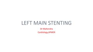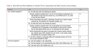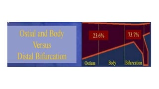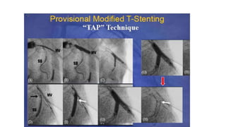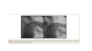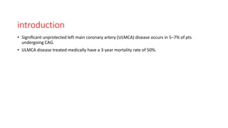 2. Studies have shown PCI with drug-eluting stents for ULMCA disease can achieve low rates of death, MI, and TLR at 12 months compared to bare-metal stents which had high rates of restenosis and mortality.