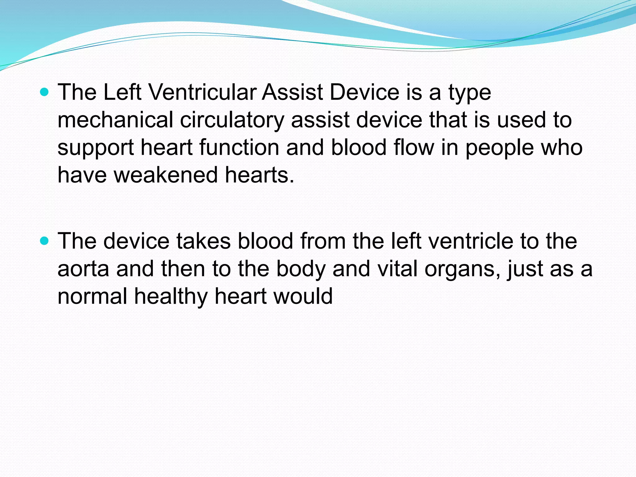 The Left Ventricular Assist Device (LVAD) is a mechanical pump that takes blood from the left ventricle of the weakened heart and pumps it to the body, similar to a normal heart. The LVAD has four main components - an internal pump, internal/external driveline, external controller, and batteries. The pump is placed in the heart and connected to the ventricle and aorta. The driveline connects the pump to the controller. The controller operates and monitors the pump. Batteries power the device and must be recharged. When assessing a patient with an LVAD, listen for pump sounds, check for alarms, identify the device type, treat any medical issues, and transport