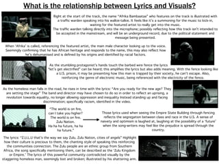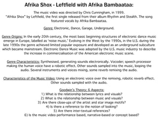 The music video was directed by Chris Cunningham in 1999 for the song "Afrika Shox" by Leftfield featuring Afrika Bambaataa. The video tells the narrative story of a homeless man stumbling through the streets of New York City. Through close-ups and the man's interactions, the video references themes of dehumanization, racial segregation, and the struggles faced by those at the bottom of the social hierarchy in conforming to society's expectations. Stylistic elements like lighting, locations, and synchronization with the electronic music help illustrate the underground genres of garage and dance music associated with the song.