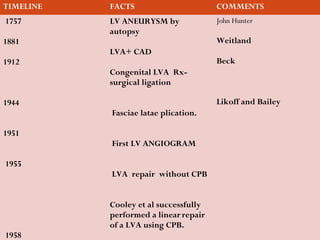 - A timeline of important discoveries and advances in LV aneurysm research and treatment from 1757 to 1958.