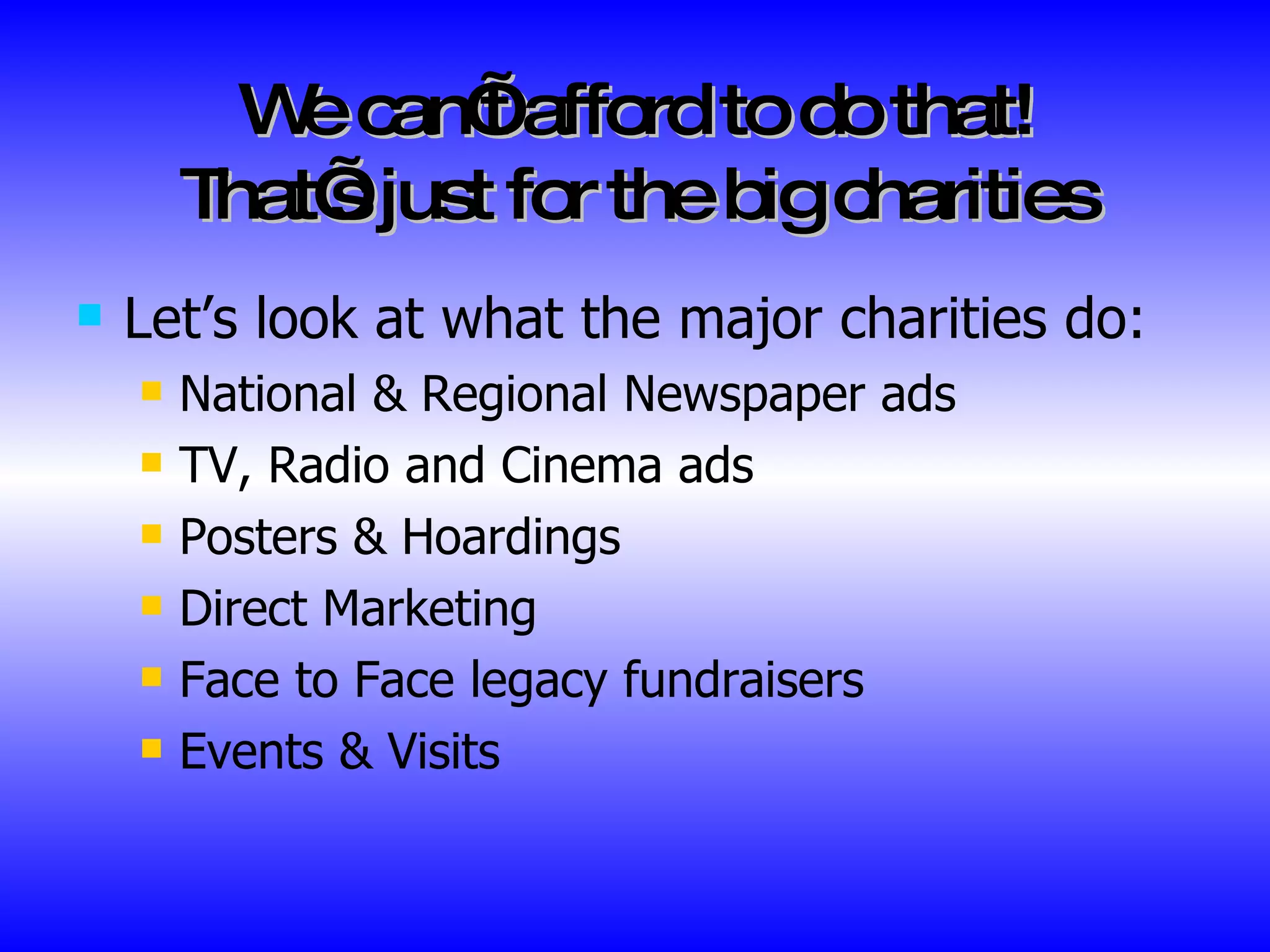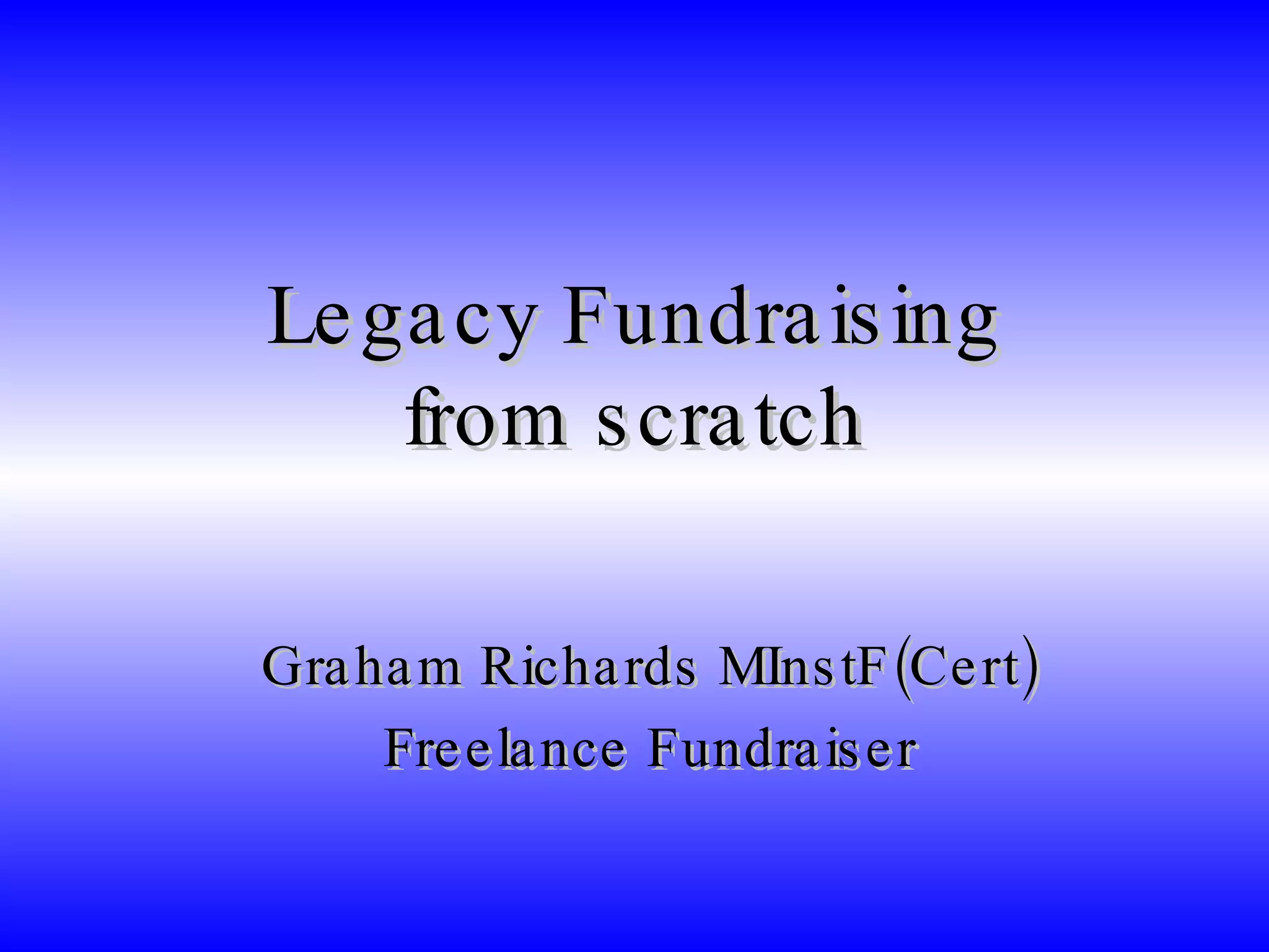 Legacies are an important potential source of voluntary income for charities. While large charities engage in expensive advertising campaigns, smaller charities can start legacy fundraising with minimal costs by focusing on current supporters. Researching any previous legacies received and the demographics of existing supporters can help inform a legacy fundraising strategy. Messaging through existing communications like newsletters and websites can help raise awareness about including charities in wills. Targeting specific groups like single people without children may also help attract new legacy donors.
