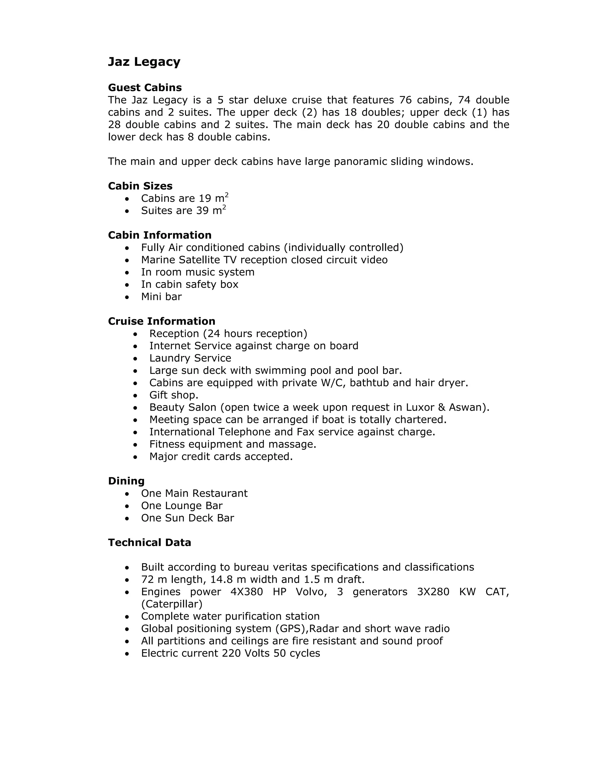 The Jaz Legacy is a luxury cruise ship with 76 cabins, including 74 double cabins and 2 suites. Cabins are located on the upper, main, and lower decks and range in size from 19 square meters for standard cabins to 39 square meters for suites. All cabins are air conditioned and equipped with satellite TV, music, safety boxes, and mini bars. Additional amenities on the ship include a reception desk, internet, laundry service, swimming pool, gift shop, dining areas, bars, fitness equipment, and meeting spaces.