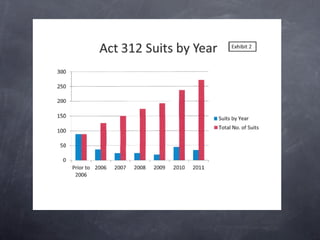 The document summarizes Louisiana's Legacy Lawsuit and ACT 312 process for addressing oil and gas contamination on private property. It outlines that the last operator of record is responsible for remediating contamination to state standards. It also discusses standards like 29-B and RECAP for remediation, the role of the Department of Natural Resources, and landowner rights and options under the process. Key points of contention like timelines, admission of liability, and use of RECAP standards are also covered.