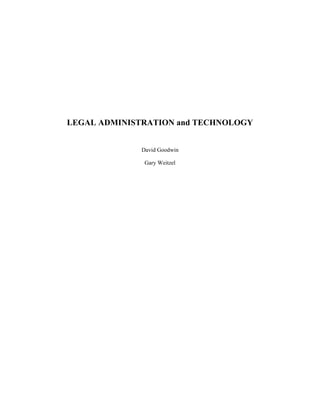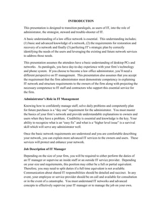 This document outlines the essential role of legal administrators in managing IT within law firms, emphasizing the need for a solid understanding of network components and effective problem-solving skills. It discusses responsibilities such as supervising IT staff, budgeting for technology, and ensuring robust training programs, alongside the benefits of leveraging both in-house and cloud solutions for IT needs. The presentation aims to equip paralegals with the knowledge and tools required to transition successfully into IT management roles within their firms.