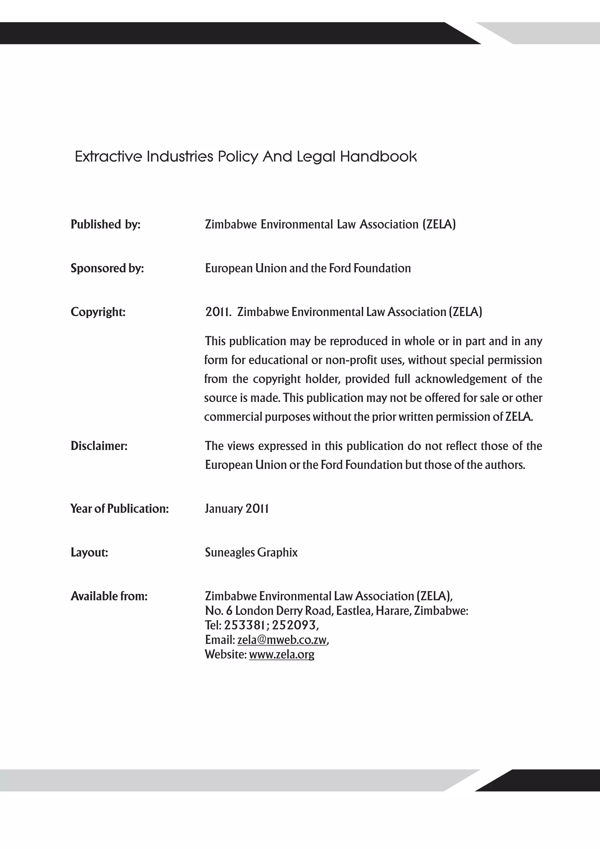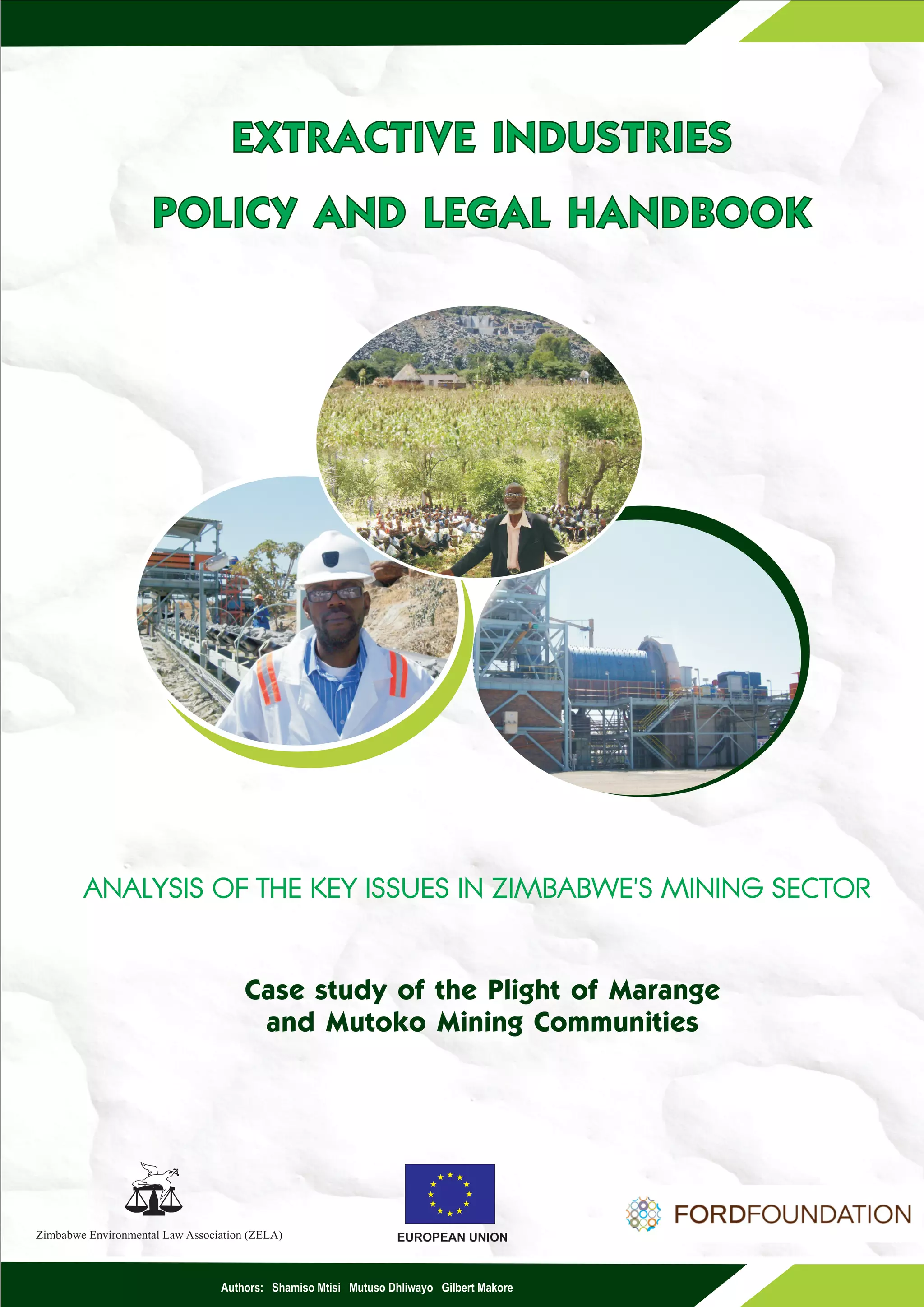 This handbook provides concise summaries of key issues in Zimbabwe's mining sector and recommendations to promote transparency and protect community rights. It analyzes legal frameworks regarding land rights, participation, taxation, and accountability. Case studies of alluvial diamond mining in Chiadzwa and granite mining in Mutoko illustrate human rights violations and environmental degradation. The handbook concludes by recommending constitutional, legislative, and policy reforms to ensure communities benefit from mining and their economic, social and cultural rights are respected.
