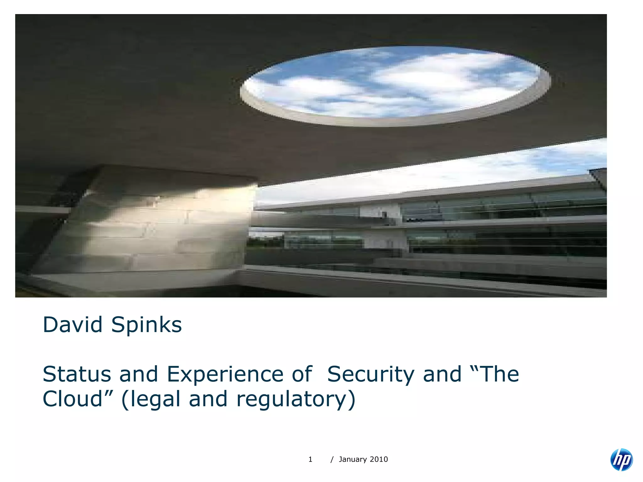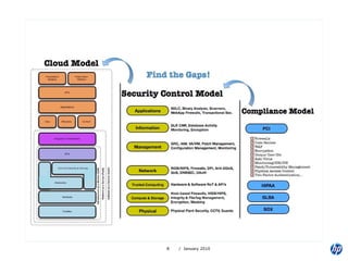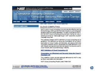 The document provides an overview of 11 domains related to security in cloud computing. It summarizes recommendations for governance, risk management, compliance, auditing, information lifecycle management, portability and interoperability, traditional security practices, data center operations, incident response, application security, and encryption in cloud environments. The document emphasizes the importance of thorough risk analysis, contractual agreements, ongoing assessment and monitoring when adopting cloud services.