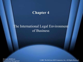 The document discusses the international legal environment for business. It covers three levels of law: international law, regional laws like those of the EU and NAFTA, and national laws of individual countries. International law comes from treaties between nations and customs. The document outlines implications of laws on intellectual property rights and anti-bribery legislation like the Foreign Corrupt Practices Act. It provides examples of differences in national laws regarding issues like vacations and legal systems.
