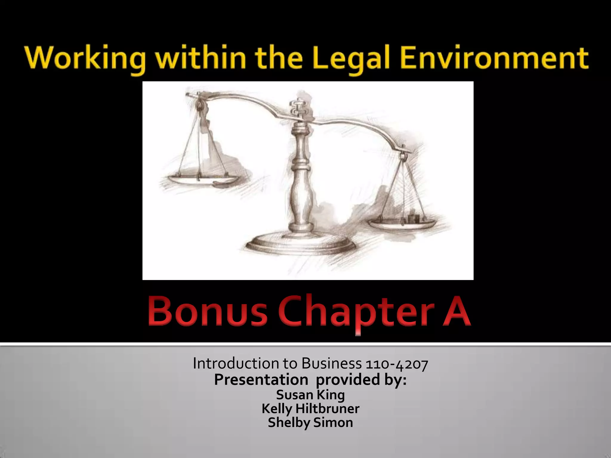 This document provides an introduction to business law 110-4207 presented by Susan King, Kelly Hiltbruner, and Shelby Simon. It discusses the US judicial system including criminal and civil law. Examples of criminal and civil cases are given. The presentation then focuses on business law and how the judicial system oversees business activities. Key business law concepts like statutory law, common law, administrative agencies, torts, patents, trademarks, copyright, sales law, contracts, antitrust law, consumer protection, and bankruptcy are defined. The importance of understanding legal issues in business is emphasized.
