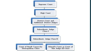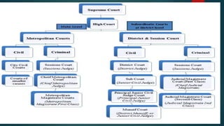 The document summarizes the hierarchy of criminal and civil courts in India. For criminal courts, it lists the various classes from highest to lowest as the Supreme Court, High Courts, Courts of Session, Judicial Magistrates of the First Class/Metropolitan Magistrates, Judicial Magistrates of the Second Class, and Executive Magistrates. It then briefly describes the jurisdiction of subordinate criminal courts, noting a Sessions Judge can sentence up to life imprisonment while lower courts can sentence for fewer years or fine smaller amounts. For civil courts, it outlines they deal with non-criminal cases and judges have different powers than criminal courts. It also summarizes the different types of jurisdiction and then the hierarchy from District Courts down to Munsifs