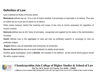 The document outlines the introduction to legal method for LLB students at Chanderprabhu Jain College, detailing the definitions, functions, and classifications of law. It covers key concepts such as the distinction between public and private law, sources of law, and the relationship between law and morality. Additionally, it discusses the role of legislation, customs, and the dynamics of civil and international law, emphasizing the importance of legal principles in society.