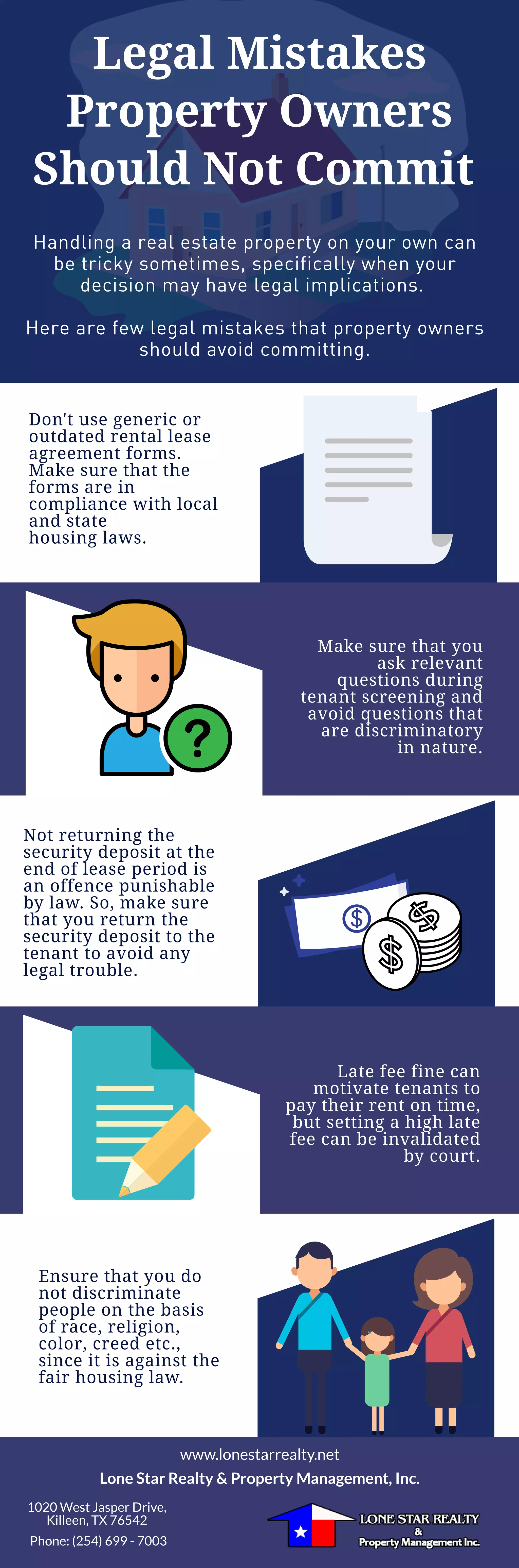 Property owners should avoid making legal mistakes when renting their properties by using updated rental agreements that comply with local housing laws, asking only relevant questions during tenant screening, returning security deposits on time, setting reasonable late fees, and not discriminating against tenants based on protected attributes like race or religion. They should consult local real estate professionals to ensure they follow all relevant laws.