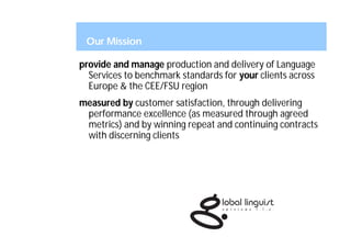 Global Linguist Services provides legal translation services with offices in Ukraine, the UK, and the US. They have over 20 staff members and a network of over 1000 translators. Their mission is to deliver high quality language services across Europe and other regions. They translate between English and other languages like Russian and Ukrainian, covering legal documentation such as contracts and patents. They emphasize quality control and confidentiality.