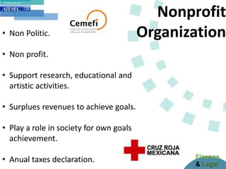 Nonprofit organizations are non-political and non-profit entities that support research, education, and artistic activities. Any surplus revenues are used to further the organization's goals, and they play a role in society by pursuing their own objectives. Nonprofit organizations must file annual tax declarations. The constitutive act establishes the basic, necessary, and fundamental data about a nonprofit organization, including that it is nonprofit, has a single organization with undefined branch offices, and allows free access to accounts. To be an authorized donative organization, a nonprofit must be published in the Official Gazette of the Federation and approved by regulatory authorities. Until 2013, it also required an external auditor.