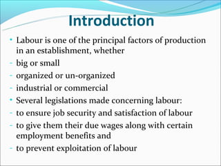 1. Several key labor laws in India require employers to provide compensation and benefits to employees. These include the Employees' Provident Fund Act, Employees State Insurance Act, Equal Remuneration Act, Payment of Wages Act, and others.